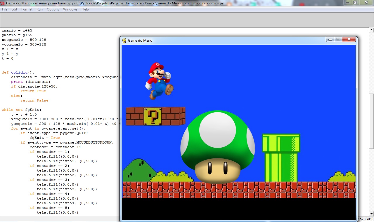 Para iniciar, é importante importar bibliotecas "math", "random" e "time" que serão necessárias para alguns comandos, além da já usada Pygames (isso é feito no começo da programação com o uso do "import"). O principal incremento é a fórmula de deslocamento do "inimigo" (que no nosso modelo é o cogumelo), que deve ser colocada dentro do loop "while not fgExit" com o uso de uma variável de contagem que definimos como "t=0". Observe abaixo: